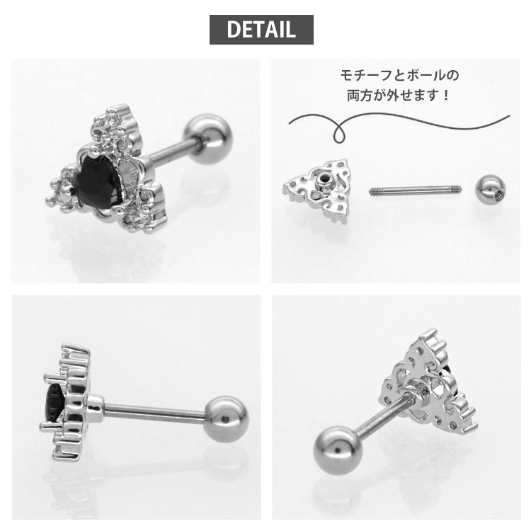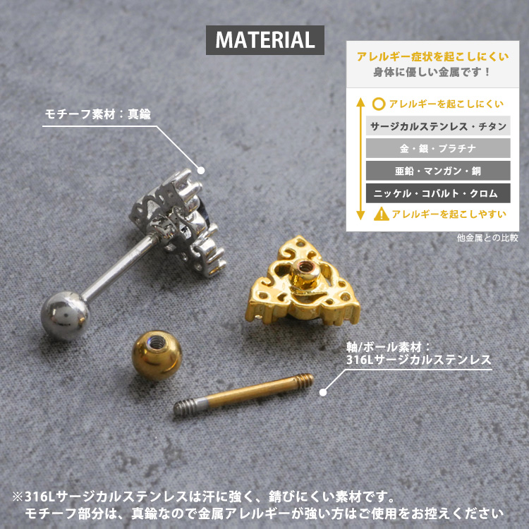 軸とボール部分はサージカルステンレス製ですが、モチーフは真鍮製ですので、アレルギーの強い方はお控えください。