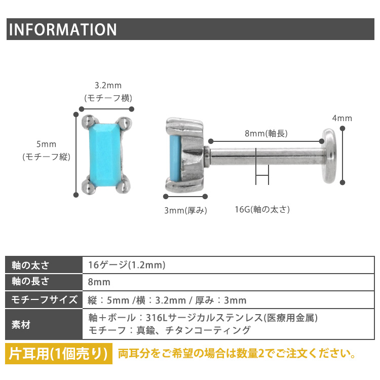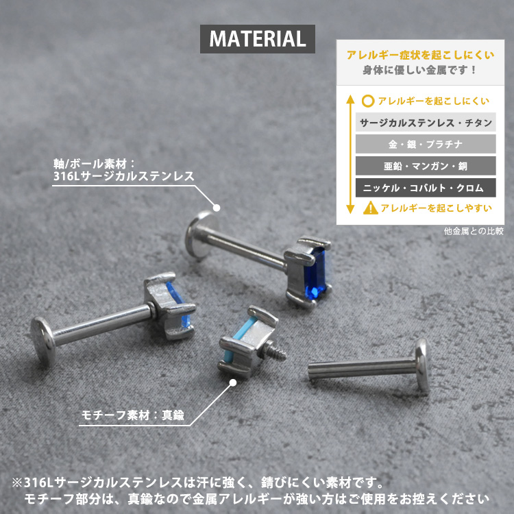 軸部分はサージカルステンレス製ですが、モチーフは銅合金製ですので、アレルギーの強い方はお控えください。
