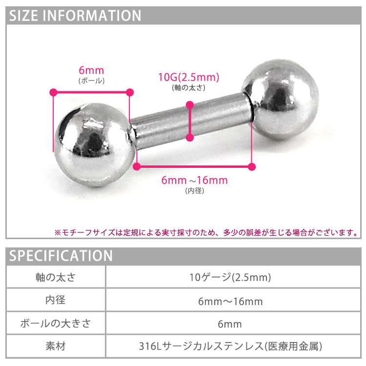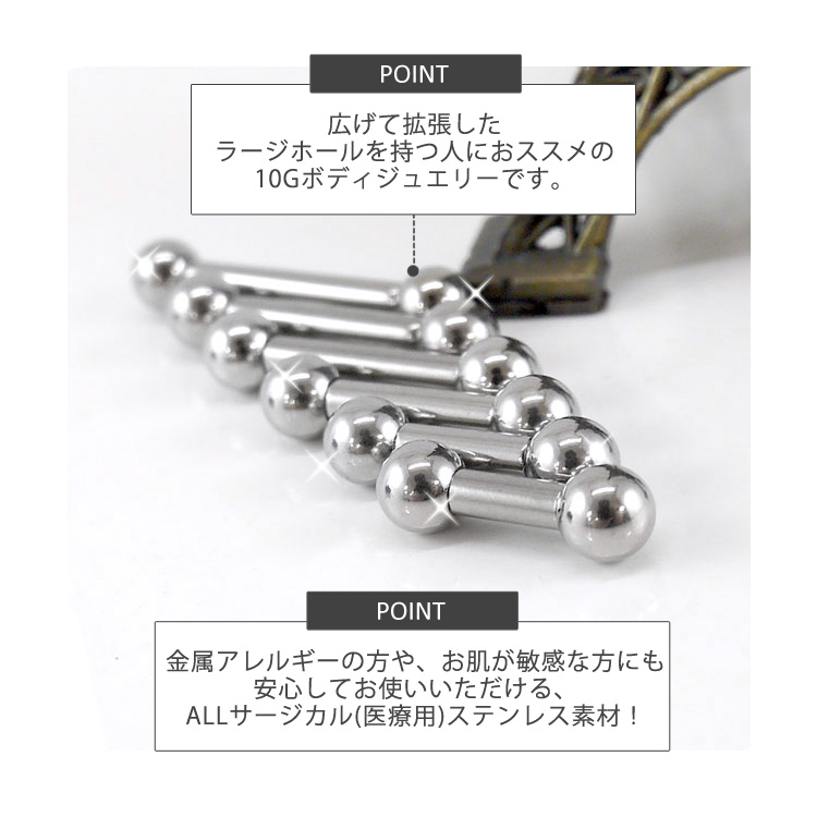 ボディピアスの定番商品、ストレートバーベル。広げて拡張したラージホールを持つ人におススメの10Gボディジュエリーです。太めサイズは存在感もインパクトもたっぷり。軸の長さも豊富なので、耳たぶはもちろん舌ピアスや耳の軟骨、乳首ピアスなど幅広い部位で大活躍。素材はもちろん全てサージカル(医療用)ステンレス。金属アレルギーが起きにくい素材なので、どんな時も安心です。オートクレーブ滅菌サービスもご利用可能です。