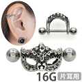 アンティーク調がオシャレなシールドと16Gのストレートバーベルがセットになった欲張りアイテム。 仮面舞踏会などで使うマスクをモチーフにした珍しいデザインです。 耳を挟むように着ける絶妙なフィット感が個性的なアイテム。 セットでの装着はもちろん、ストレートバーベル単体でもご使用いただけます。 バーベルは金属アレルギーにも安心安全の医療用ステンレス素材です。 長時間使用することの多いボディピアスにぴったりな素材です。