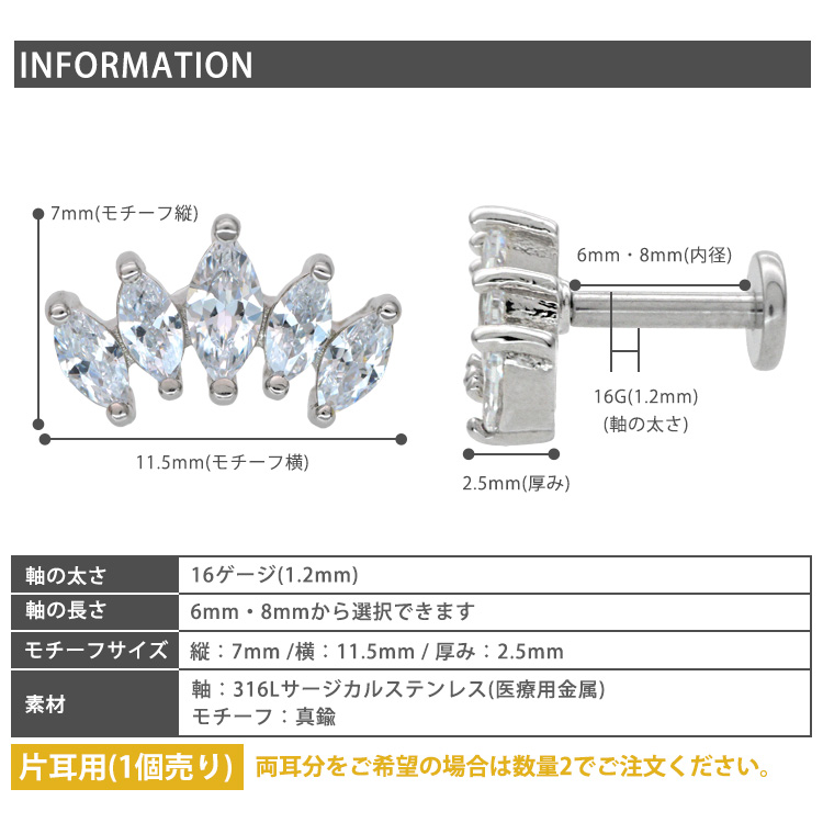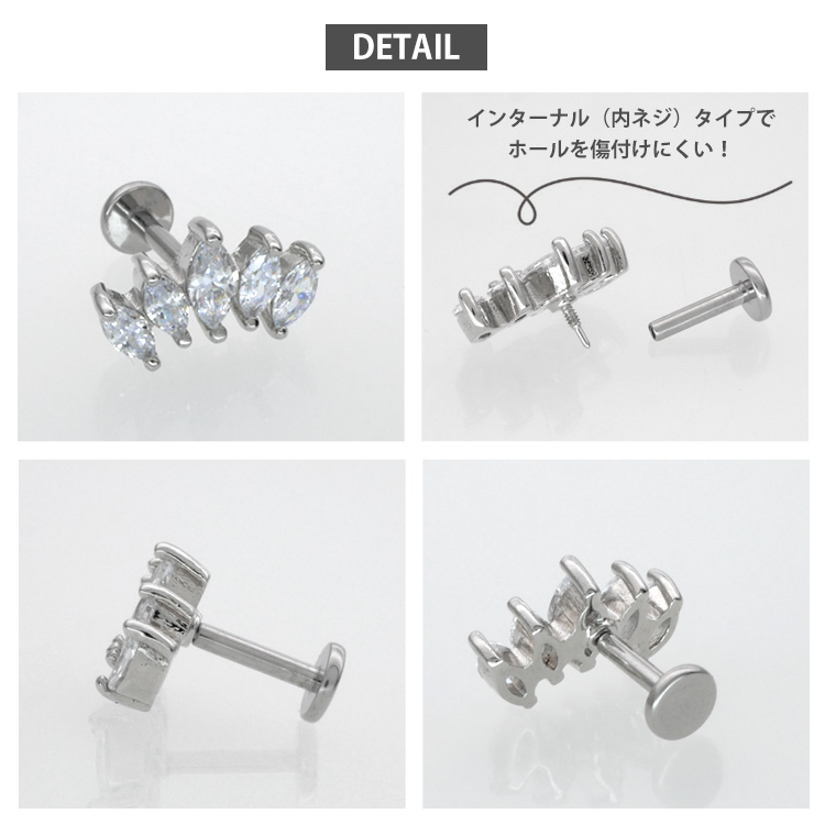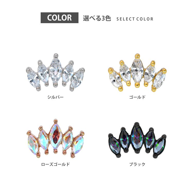 5つのジュエルが連なって、華やかな印象のラブレットピアス。 高級感のある美しい輝きです。 色違いの複数着けにもおススメです。 サイズは人気の16Gをご用意致しました。 ホールに優しいインターナル(逆ネジ)タイプは、もちろんファーストピアスにも使用できる医療用ステンレス製なのでダブルで安心のオススメアイテム。