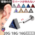 ボディピアスの定番アイテム、ラブレットスタッドがワンプッシュタイプの斬新設計に。 ありそうでなかった、ネジ不使用のボディピアスが登場。トラガスのような狭い部位や、ネジタイプが苦手な方には特にお勧めです。シンプルな三角形モチーフが使いやすい。プチサイズモチーフのピアスは、単品使いでもさり気なくておしゃれですし、コーディネートのワンポイントとしても活躍しそうなアイテムです。 ヘッド部分から伸びるピンを軸に差し込めば装着完了です。ネジが無いので、知らない間に緩んできて失くしてしまった、そんな悩みからも開放されます。