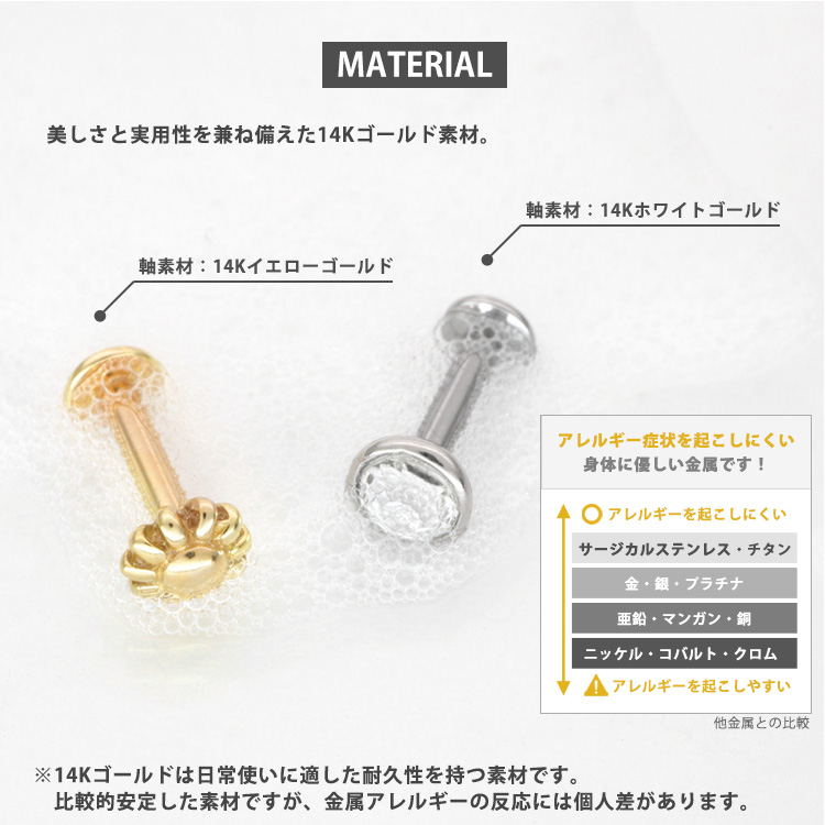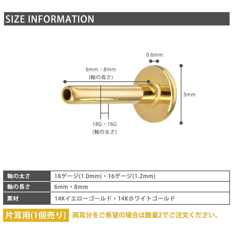 カラー | ゲージサイズ | 内径(軸の長さ) | 価格 | 在庫 | ホワイトゴールド | 18G | 6mm | 6,500円 (税込) | ○ | 8mm | 6,500円 (税込) | ○ | 16G | 6mm | 7,800円 (税込) | ○ | 8mm | 7,800円 (税込) | ○ | イエローゴールド | 18G | 6mm | 7,500円 (税込) | ○ | 8mm | 7,500円 (税込) | ○ | 16G | 6mm | 8,800円 (税込) | ○ | 8mm | 8,800円 (税込) | ○ |