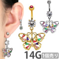 まるで飴細工のような、カラフルなジュエルが散りばめられた蝶々モチーフのおへそピアス。 大きめのサイズ感で、おへそでも耳でも目を惹くこだわりのデザインです。 軸とボール部分はサージカルステンレス製、モチーフは真鍮で、シルバーはロジウムコーティング、ゴールドとローズゴールドは14Gゴールドコーティングを施してあります。