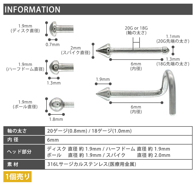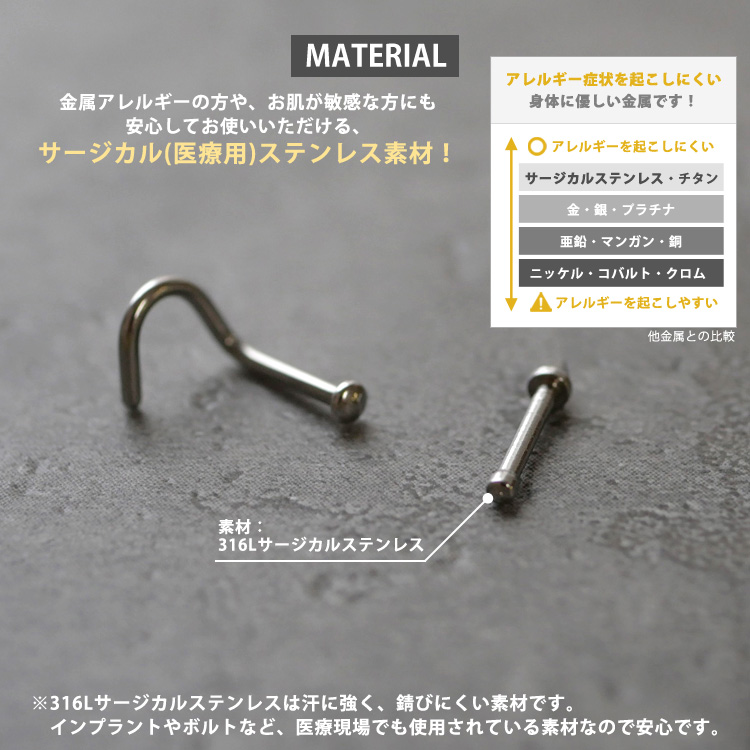 シャフトがスクリュー・ストレートタイプからお好みの形状をご選択できます。一つは持っていたい先端がシンプルな鼻ピアスです。 キャッチやネジが無いので、取り扱いも簡単。太さは20G・18Gの2サイズからお選びいただけます。アレルギーが起きにくいサージカル(医療用)素材なので安心です。もちろんファーストピアスにも使用できます。