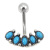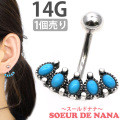 アンティーク調の台座にターコイズストーンをあしらったおへそピアス。5つ並んだ鮮やかなターコイズブルーが存在感抜群でかっこよくきまります。おへそのピアスとしてだけでなく、耳につけてもかっこよく決まります。材質はアレルギーが起きにくいサージカル(医療用)なので安心してお使いいただけます。太さのサイズはへそピアスでよく使用される14Gとなります。
