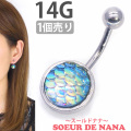 マーメイドの鱗のようなボディピアスです。角度によって見える色が変わるオーロラカラーと鱗のような立体デザインがとても魅力的。おへそピアスだけでなく、耳につけても可愛いデザインです。材質はアレルギーが起きにくいサージカル(医療用)なので安心してお使いいただけます。