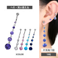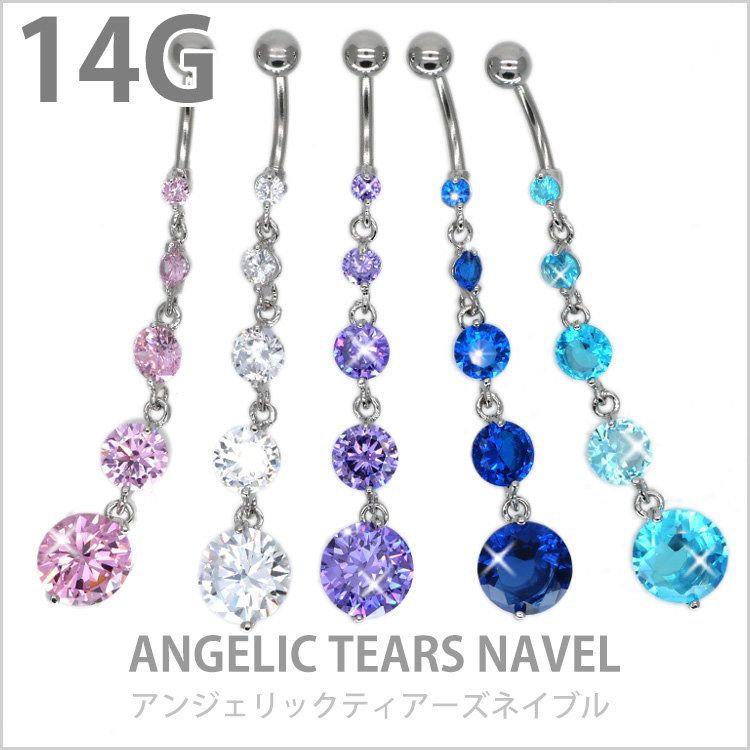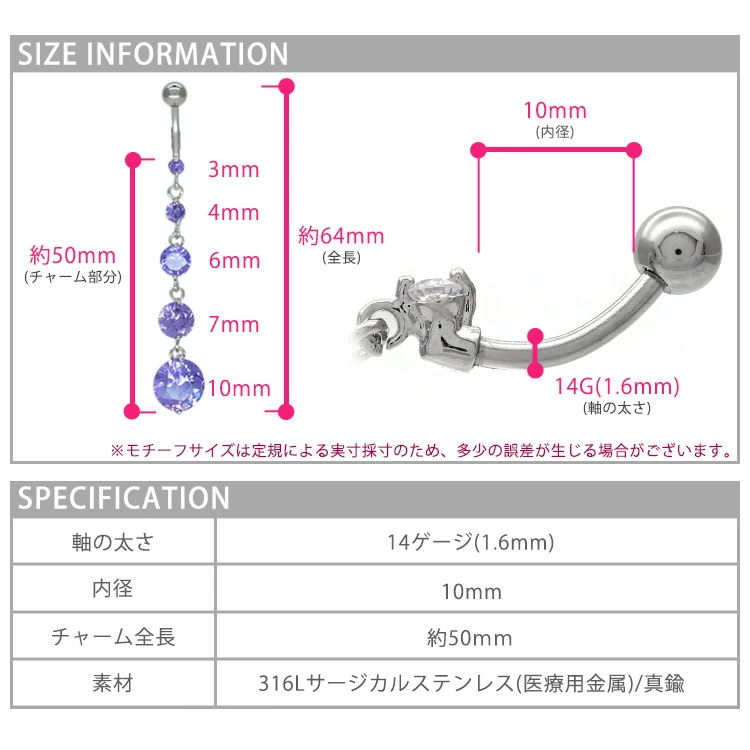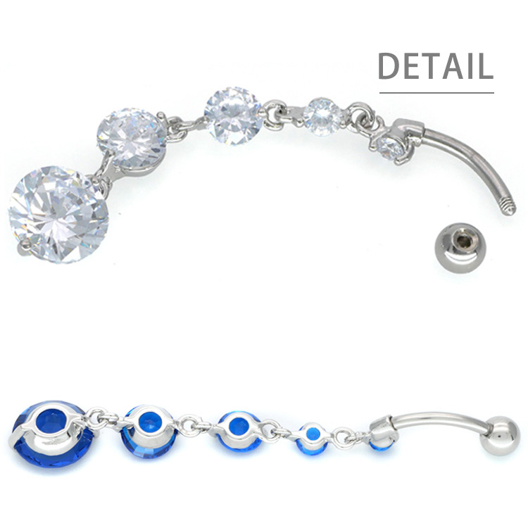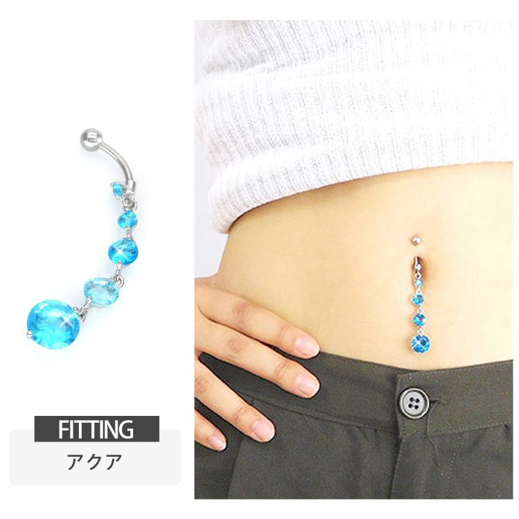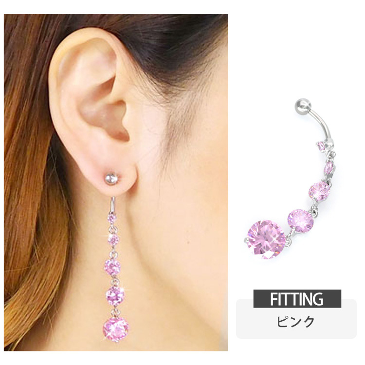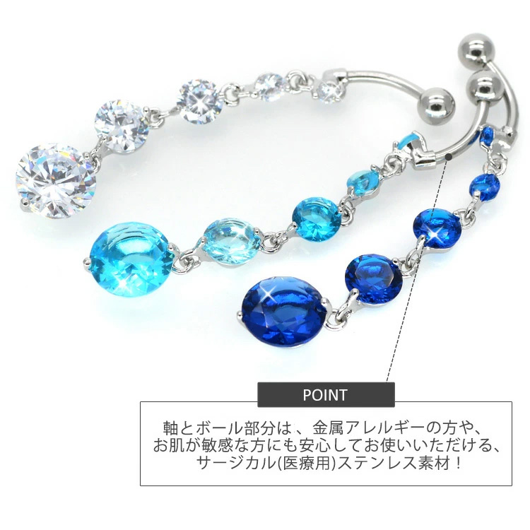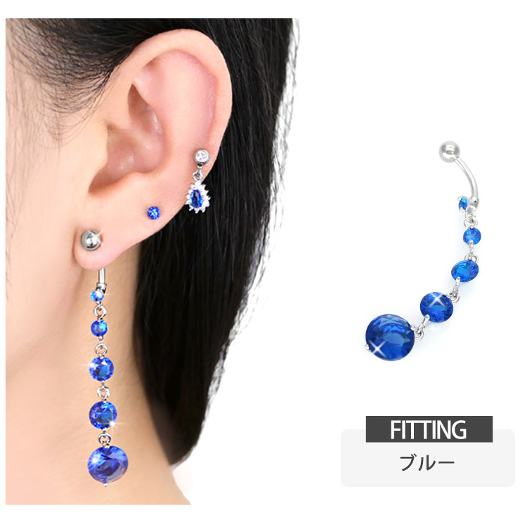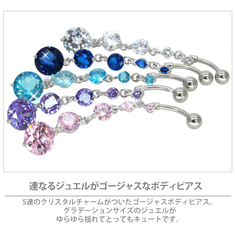 5連のクリスタルチャームがついたゴージャスボディピアス。グラデーションサイズのジュエルがゆらゆら揺れてとってもキュートです。カラーはクリア、ピンク、水色(アクアブルー)、青(ダークブルー)、紫(タンザナイト)から選べます。おへそにはもちろん、耳たぶに着けてもとってもおしゃれです。素材はアレルギーが起きにくいサージカル(医療用)なので安心してお使いいただけます。