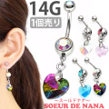 おへそのピアスとしてだけでなく耳に着けてもラブリーでキュートです。 女性らしさをアピールできる、揺れるおへそピアス。 4色からお選びいただけます。へそにはもちろん、耳たぶに着けてもとってもおしゃれです。素材はアレルギーが起きにくいサージカル(医療用)なので安心してお使いいただけます。