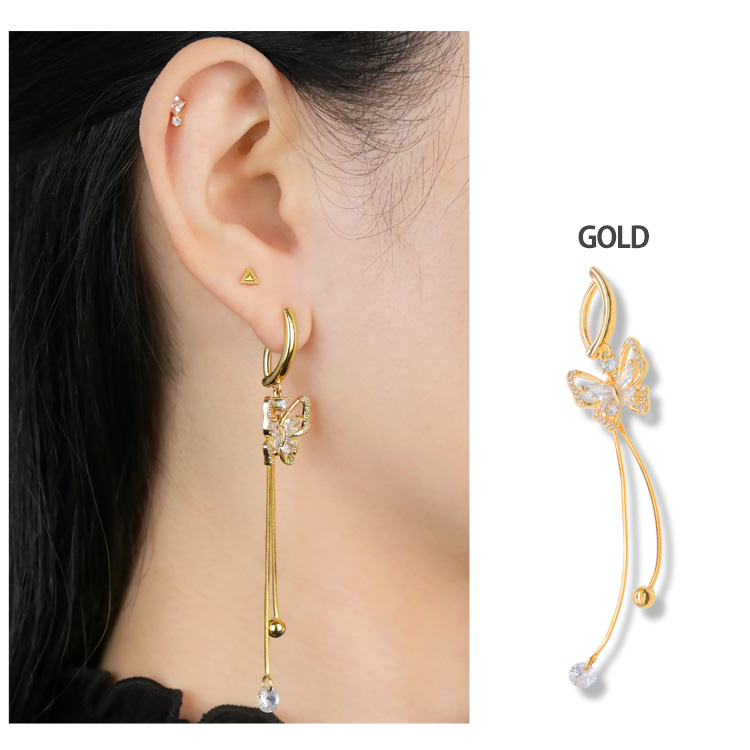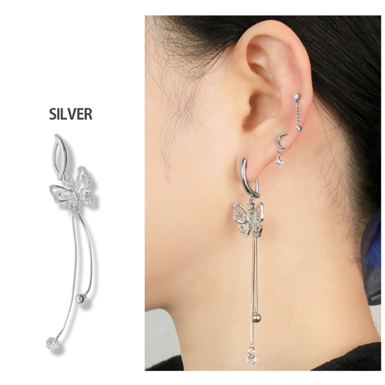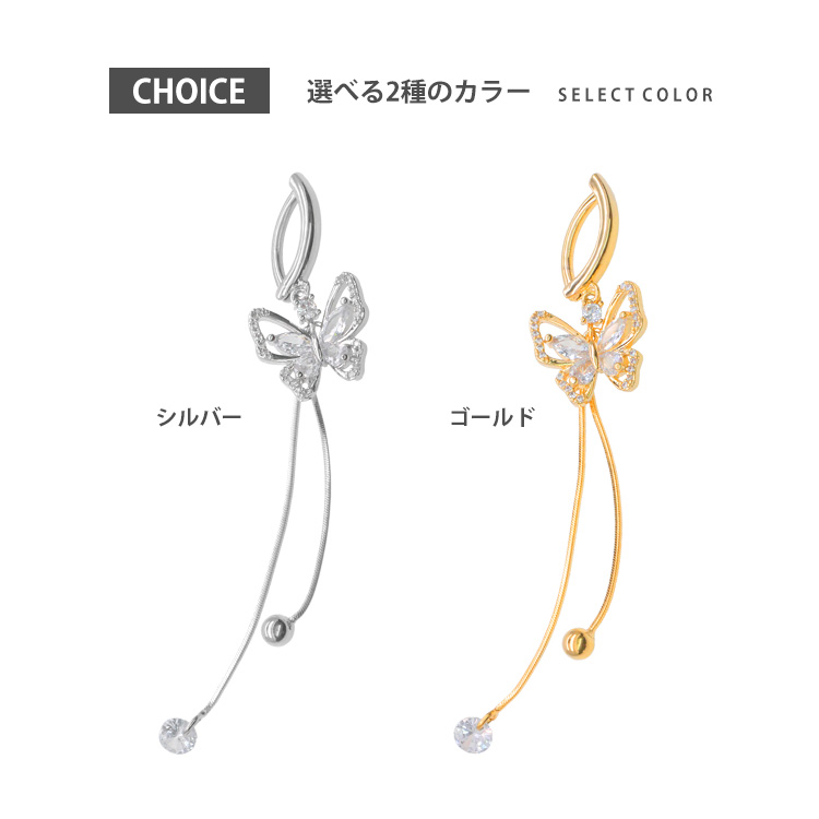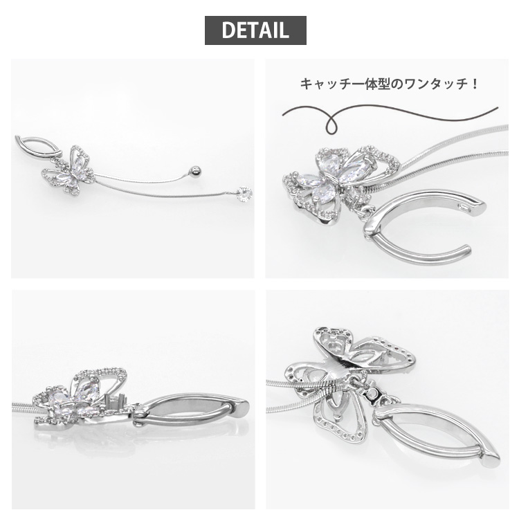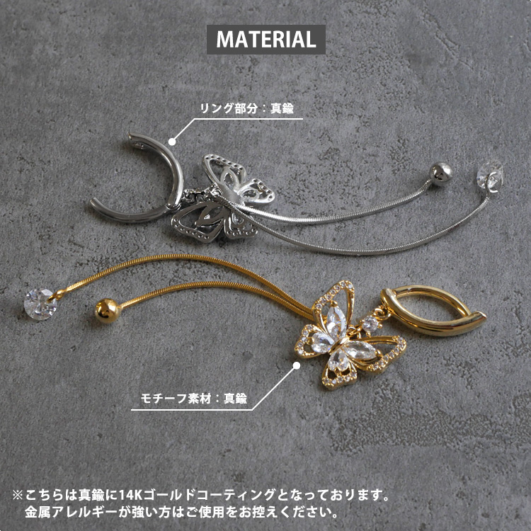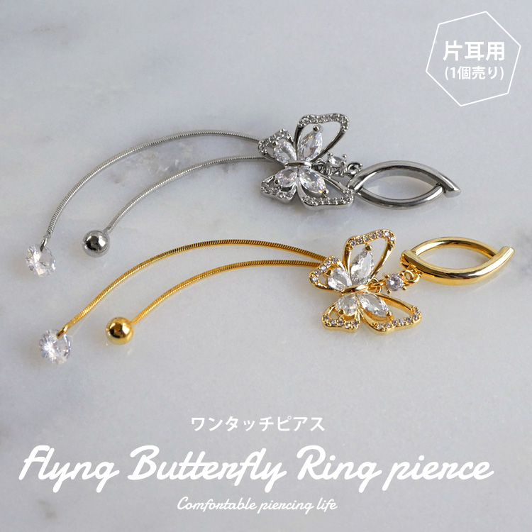 蝶が飛んでいるようなデザインの華やかなフープピアス。 透かしデザインのバタフライが美しい高見えリングピアスです。 ヒンジで開け閉めできるキャッチ一体型のワンタッチ構造なので簡単で快適な使い心地です。 キャッチをなくす心配もない、不器用さんも安心のクリップリングです。 肌に直接触れるフープ部分はアレルギーが起きにくい医療用のサージカルステンレス素材なので安心です。