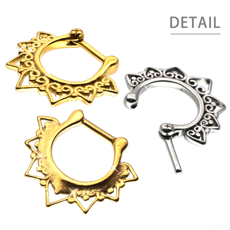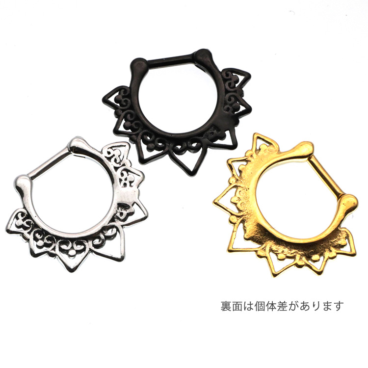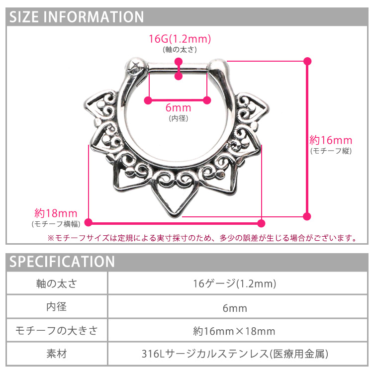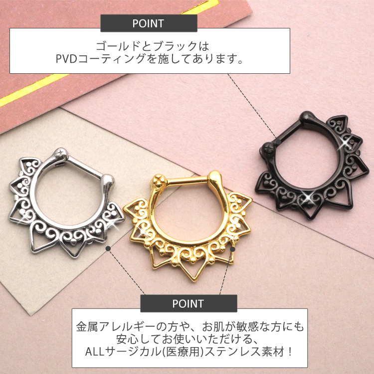 ハートのレースのようなかわいいデザインのピアスです。取り外しはパチッとワンタッチで着けられるのでキャッチを失くす心配もありません。カラーは使いやすいシルバー、ゴールド、ブラック、そしてカラフルなレインボーの4色展開です。太さは耳たぶピアスにも軟骨ピアスにも使いやすい16Gサイズです。ピアスの素材には、金属アレルギーでも安心の医療用素材316Lサージカルステンレスを採用、時間が経っても変色や変形しにくく、金属の輝きが色褪せません。