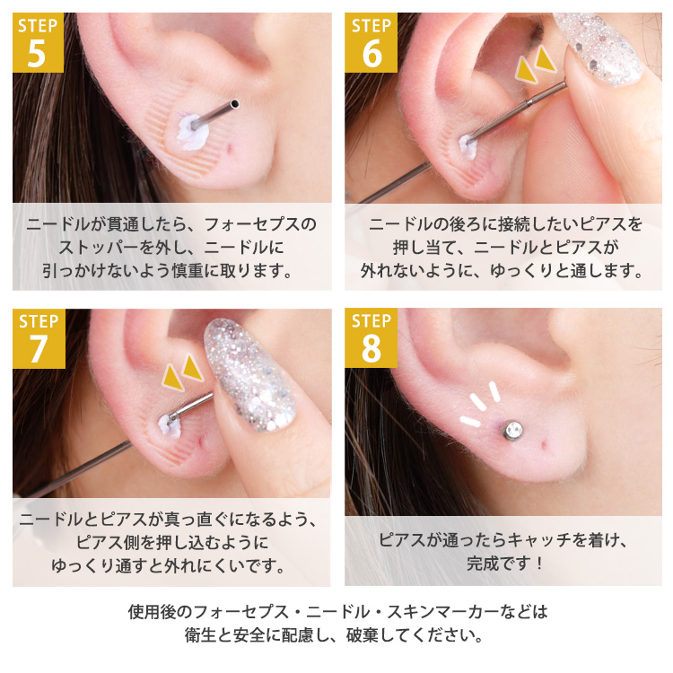 使い捨て仕様なので、複数人での使用や再使用によるリスクを抑え、 セルフピアッシングで便利にご使用いただけます。