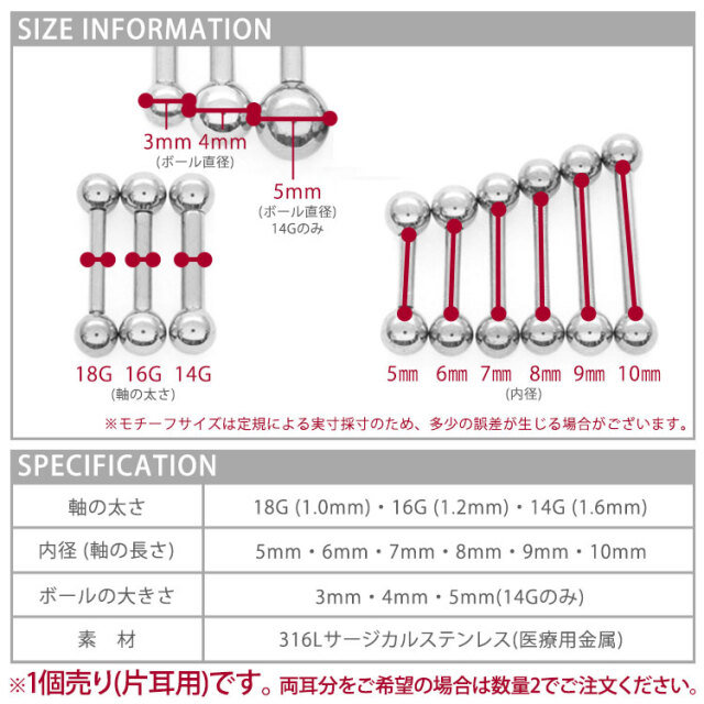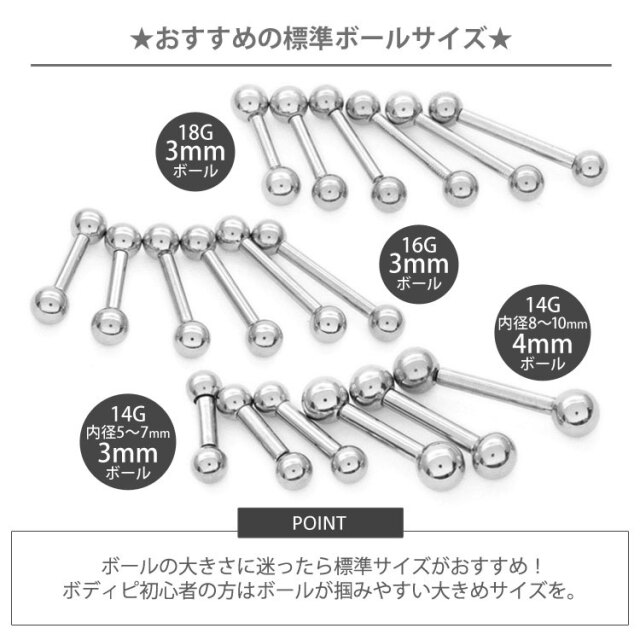 ・ゲージ(18G/16G/14G)、内径(5mm〜10mm)、さらにボールサイズ(3mm〜6mm)まで、お客様のスタイルに合わせて細かく選択が可能。専門店だからこそ実現できる、こだわりのセミカスタムスタイルです。