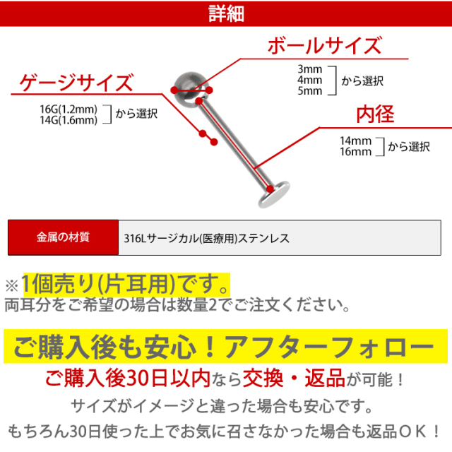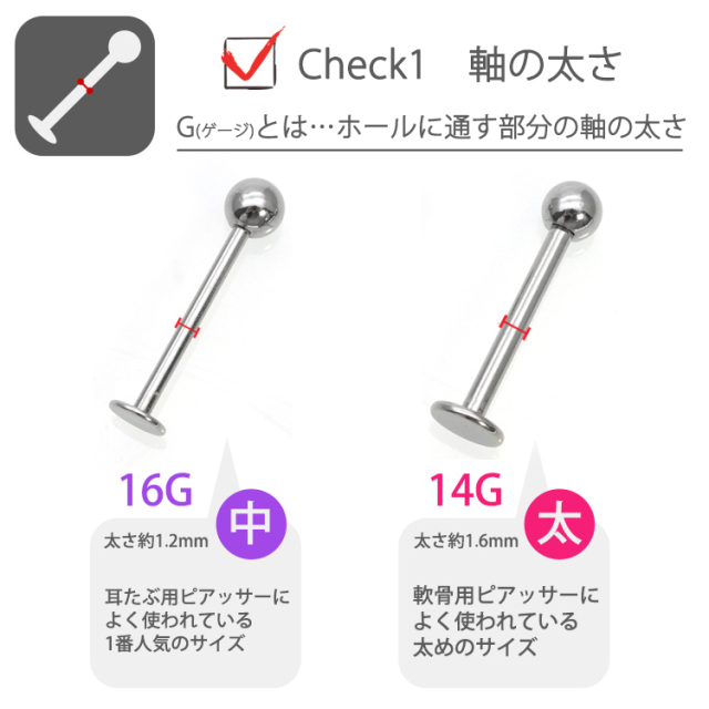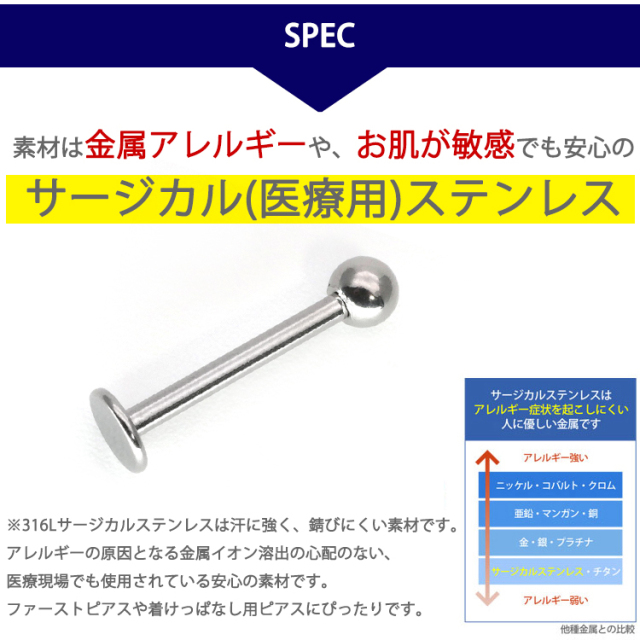 ボディピアスの定番商品、ラブレットスタッド。口ピアスのために開発されたスタイルは、片側がディスクなので狭い部位にも使える万能ジュエリー。 他ではなかなか見ないロングサイズは、バーベルタイプが苦手な方のタン(舌)ピアスに最適ですが、アレンジ次第で多くの部位で活躍します。 太さは定番の16Gと14Gをご用意致しました。 14mm、16mmの2種の内径と4種のボールサイズから選べる専門店ならではの嬉しいセミカスタムスタイルで、部位やお好みに合わせてお気に入りの一品をご選択ください。 素材は安心の医療用ステンレスだからファーストピアスにも使用できます。シンプルなボディピアスはファーストピアスにもおすすめです。サビや変色に強く、長時間使用することの多いボディピアスにぴったりの素材です。