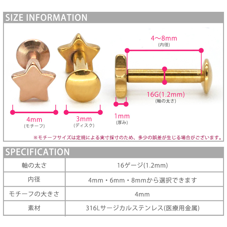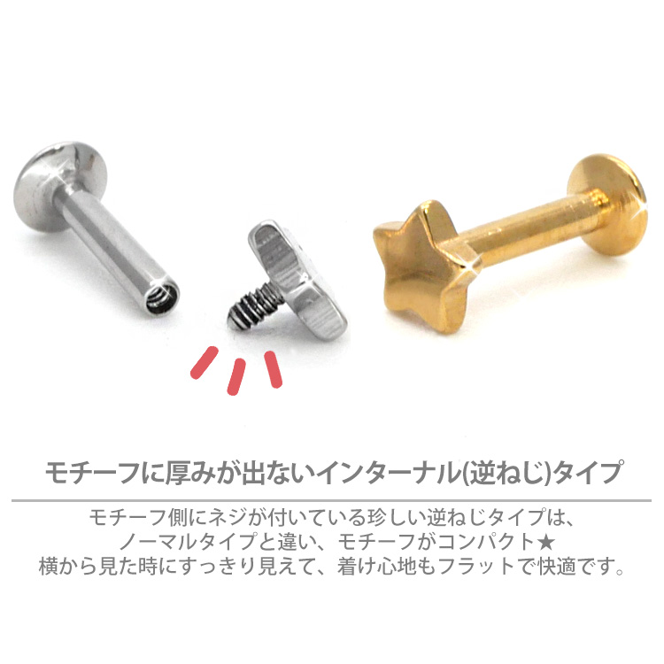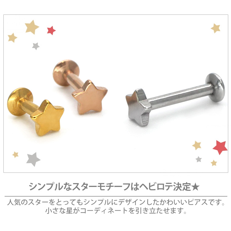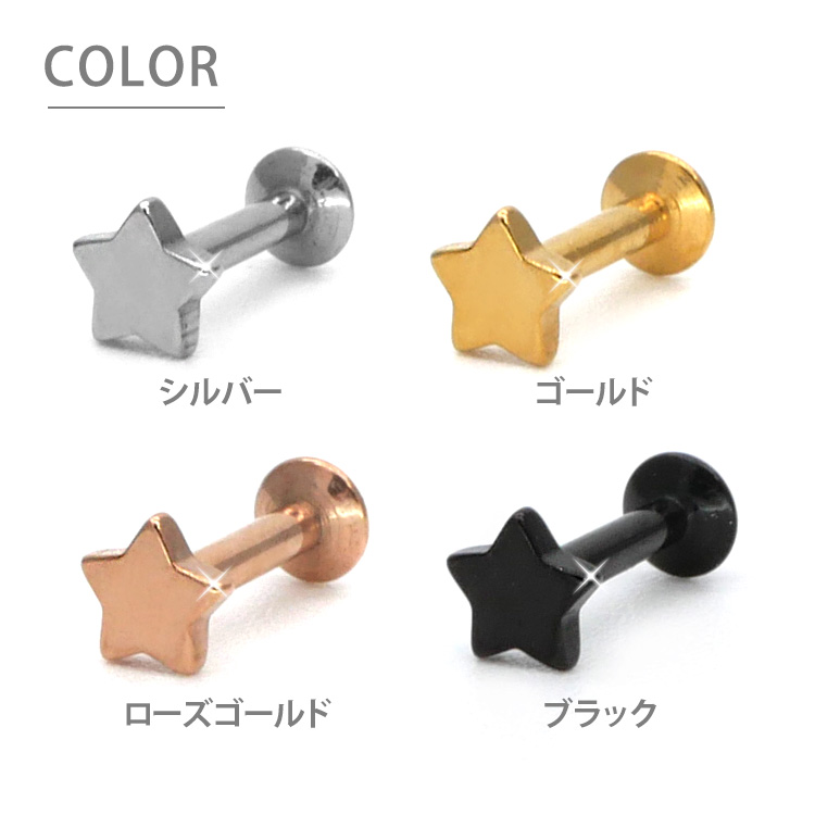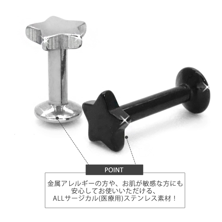 インターナルラブレットに女性に人気のスターモチーフをプラスした、とってもキュートなボディピアスです。小さな星がコーディネートを引き立たせます。 シンプルなコーデはもちろん、重ね付けコーデもぴったりですよ。 カラーはシルバー、ゴールド、ローズゴールド、ブラックと人気の4色をご用意致しました。 太さは使いやすい16G。ボディピアス初心者さんにも上級者さんにもおすすめです。 ピアスの材質には、安心の医療用素材「316Lサージカルステンレス」を採用。 時間がたっても変色や変形しにくく、金属の輝きが色あせません。