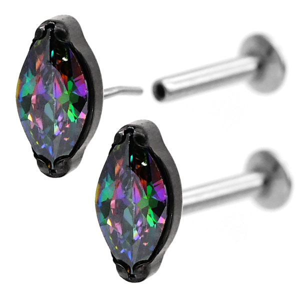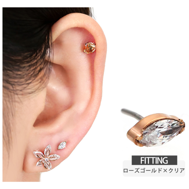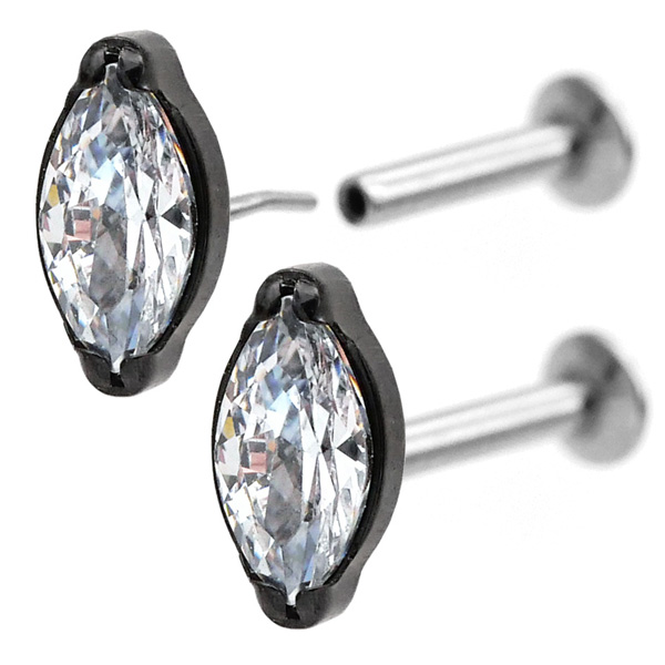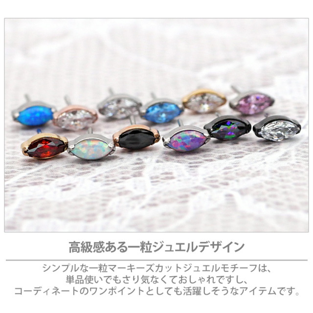 ・葉っぱのような、あるいはボートのような独特の形が美しい「マーキーズカット」のジュエルをあしらった、洗練されたデザインのボディピアスです。