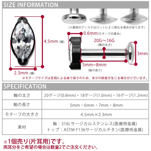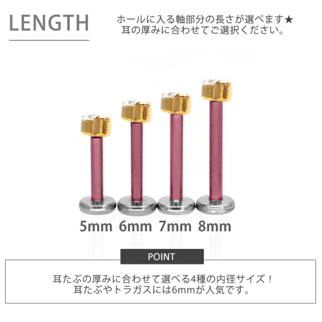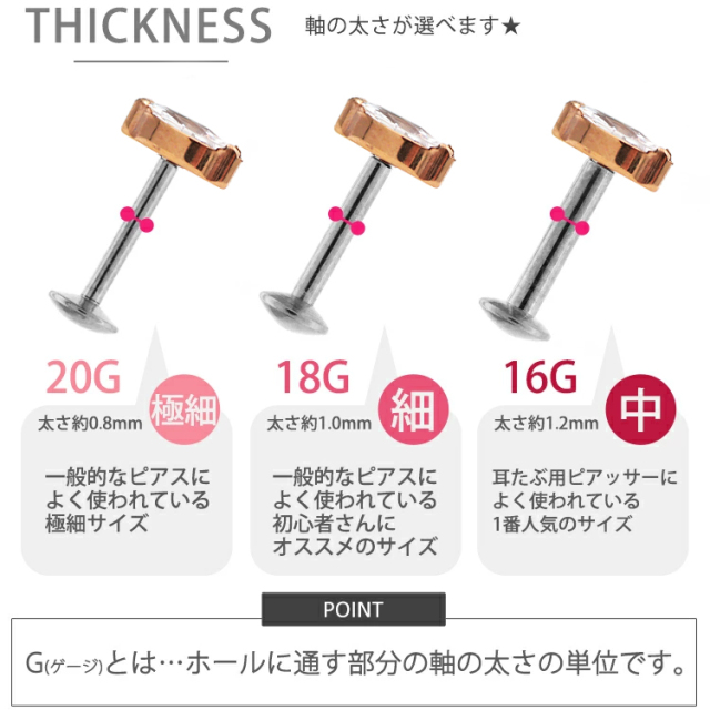 ・耳の裏側が平らなラブレットタイプなので、寝る時やヘッドフォンを使用する際も邪魔にならず、「つけっぱなし」に最適。20Gから16Gまで選べるため、普通のピアスホールの方でもお使いいただけます。