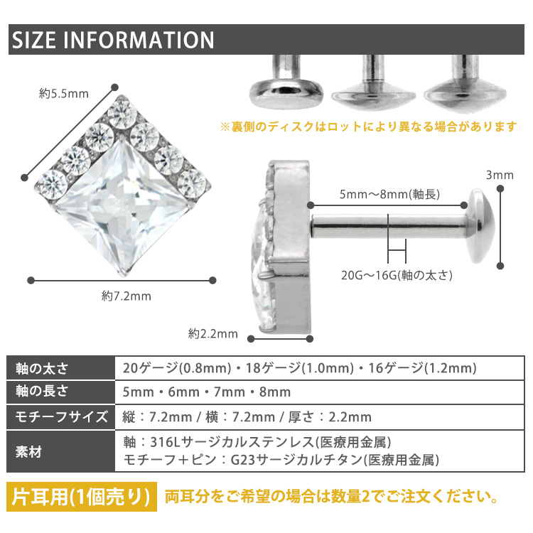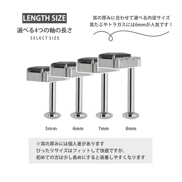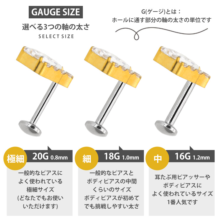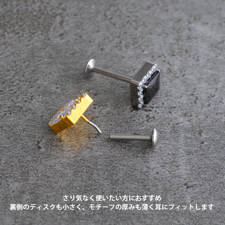 ・耳の裏側が平らなラブレットタイプなので、寝る時やヘッドフォンを使用する際も邪魔にならず、「つけっぱなし」に最適。20Gから16Gまで選べるため、普通のピアスホールの方でもお使いいただけます。