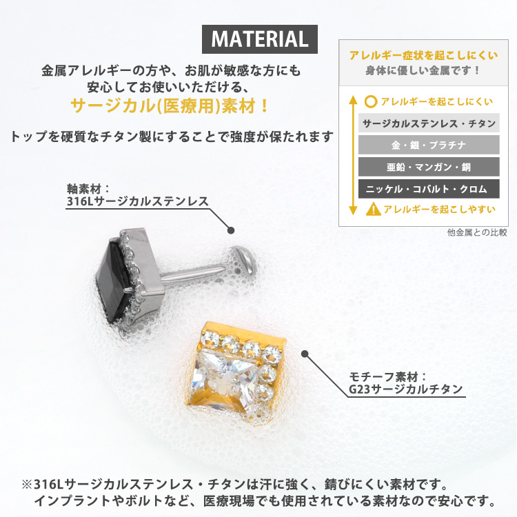 ・モチーフ部分には、医療用として最高クラスの安全性を誇るG23サージカルチタン、軸部分には信頼の316Lサージカルステンレスを採用。金属アレルギーを極限まで抑えた設計です。